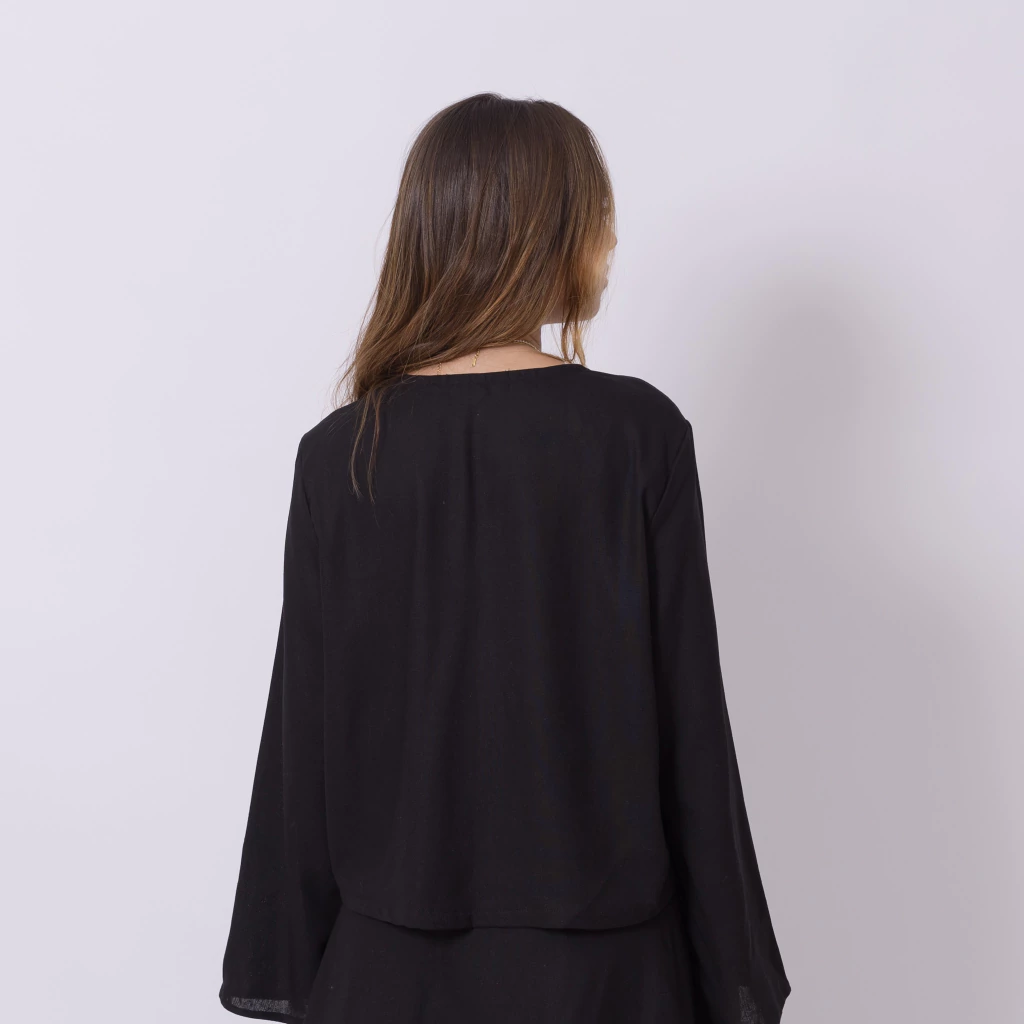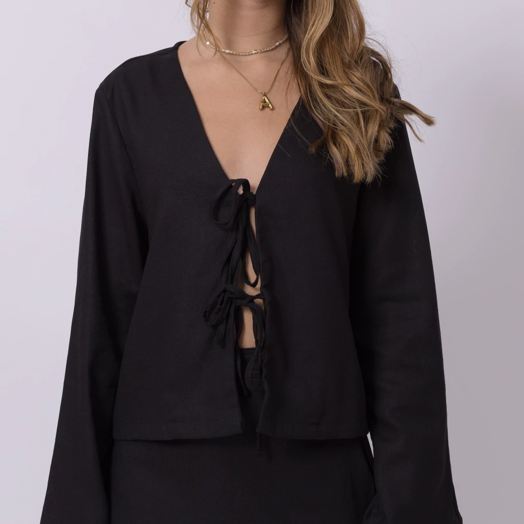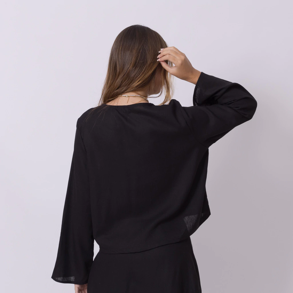 A Blusa Giu é uma bata de amarração super despojada e leve. Apesar de ter mangas compridas, é produzida em um material bem fresco de viscose com linho, então não esquenta nadinha. Pode ser usada amarrada ou com as cordinhas soltas, como uma terceira peça. As mangas da Blusa Giu são boca de sino, trazendo uma vibe boho, com bastante fluidez.