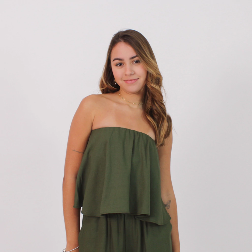 O Cropped Jade 2.0 é uma versão 100% melhorada do nosso Cropped Jade original. Ele é um tomara que caia rodado com tecido fresquinho de linho com viscose, e nessa versão, ele tem um topinho por baixo, para te deixar mais segura!